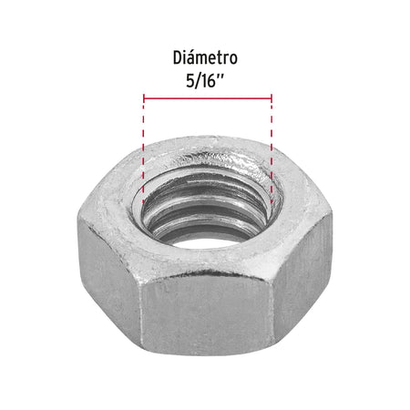 Tuercas hexagonales de acero galvanizado 5/16', ideales para uniones mecánicas firmes. Su recubrimiento anticorrosivo garantiza calidad y durabilidad. Brindan eficiencia al ensamblar estructuras metálicas, con un rendimiento fiable que cumple con los estándares más exigentes de construcción e industria.