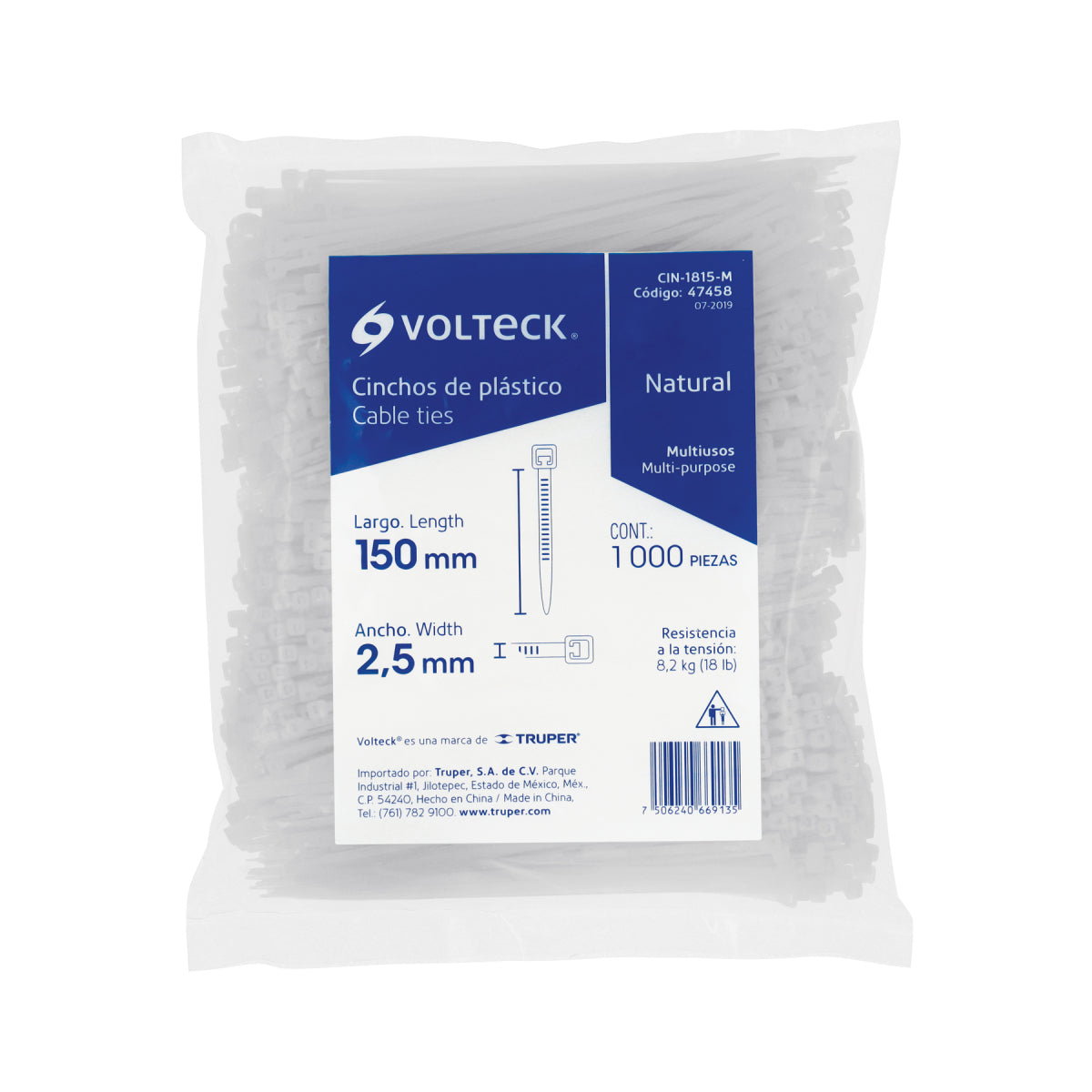 Bolsa Con 1000 Cinchos Plásticos 18Lb, 150X2.5 Mm, Naturales CIN-1815-M, Volteck