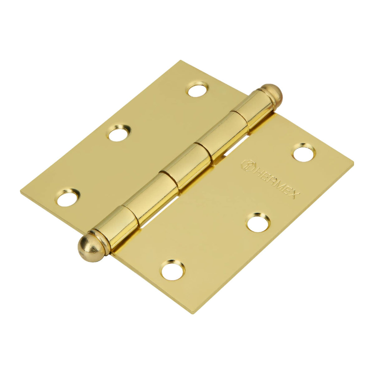 Bisagras cuadradas de 3-1/2 pulgadas con acabado latonado y cabeza redonda, que ofrecen calidad, eficiencia y un rendimiento robusto para puertas y muebles. Fabricadas para brindar durabilidad y resistencia a la corrosión, garantizando una fijación segura. Presentación en bolsa con 2 piezas para uso profesional.