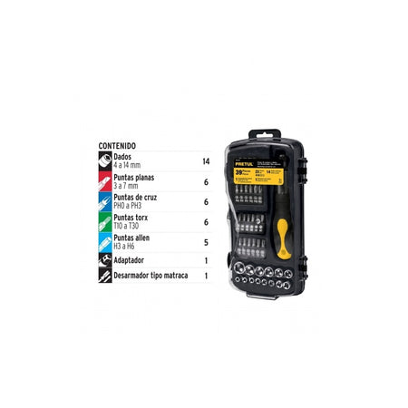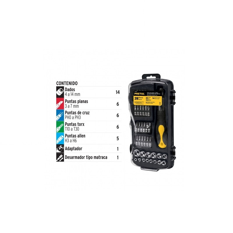El juego de dados cuadro 1/4" 39Pz Juda-39P de la marca Pretul es una herramienta esencial para cualquier mecánico o aficionado al bricolaje. Este juego incluye 39 piezas de alta calidad, fabricadas en acero cromo vanadio, que garantizan una larga durabilidad y resistencia a la corrosión. Los dados tienen un tamaño de 1/4" y vienen en diferentes medidas, desde 4mm hasta 14mm, lo que los hace ideales para una amplia variedad de trabajos. Además, el juego viene en una práctica caja de plástico que facilita su almacenamiento y transporte. Con este juego de dados, podrás realizar tus reparaciones y proyectos con facilidad y precisión.