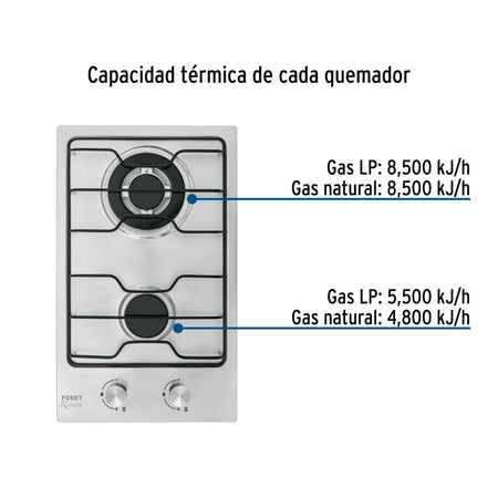 Parrilla Estufa Gas Empotrable 30Cm, 2 Quemadores Inoxidable Esmalte, Foset Pae-2F